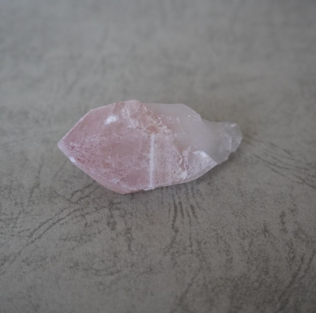 外側はシュガーパウダーのような水晶の皮膜があり内側は鉄分により透明度のある淡いクリスタルピンク色になっており大変珍しい貴重な水晶になります。
